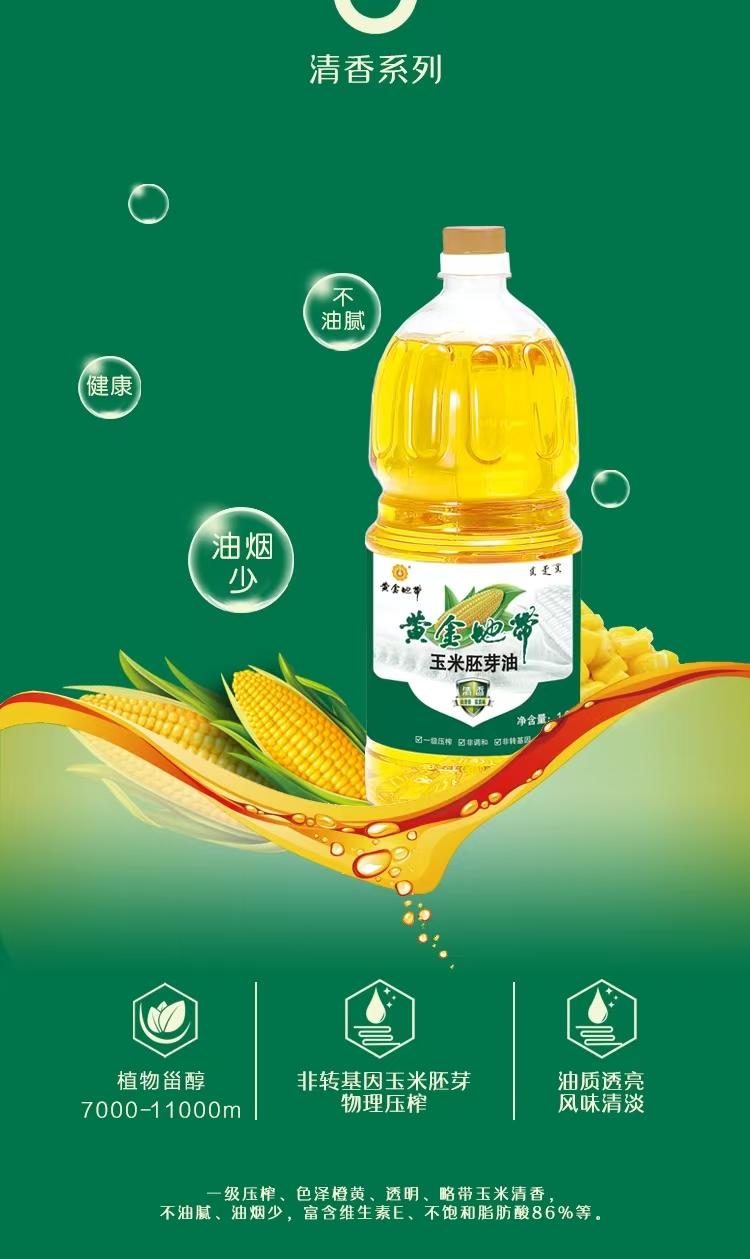 一級壓榨——黃金地帶”玉米胚芽油選用優(yōu)質玉米胚芽為原料,經(jīng)物理壓榨精煉而成;