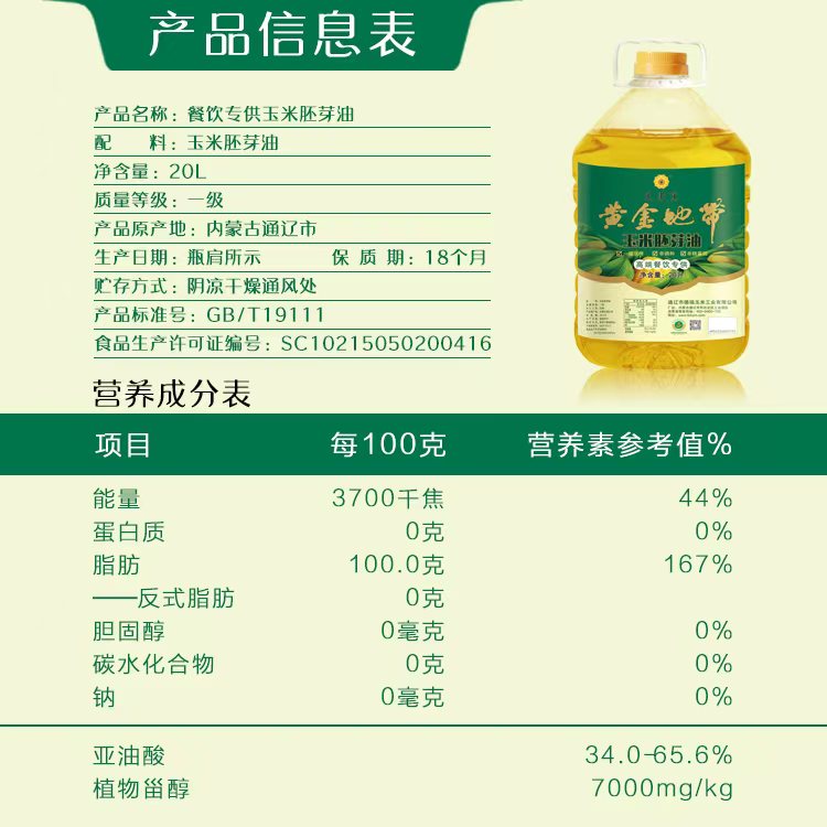 非調(diào)和——黃金地帶”玉米胚芽油不調(diào)和其他油種,是100%純玉米胚芽油;