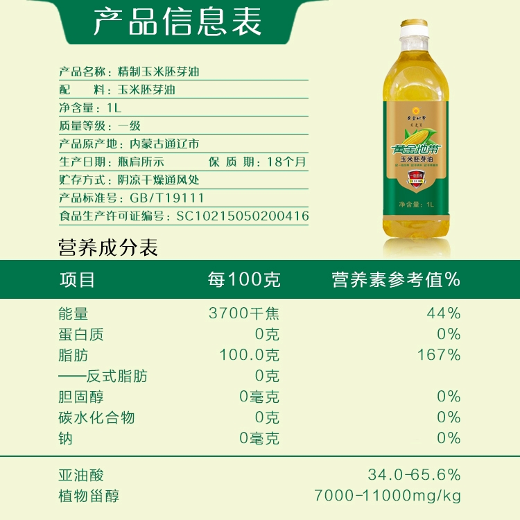 非調(diào)和——黃金地帶”玉米胚芽油不調(diào)和其他油種,是100%純玉米胚芽油;