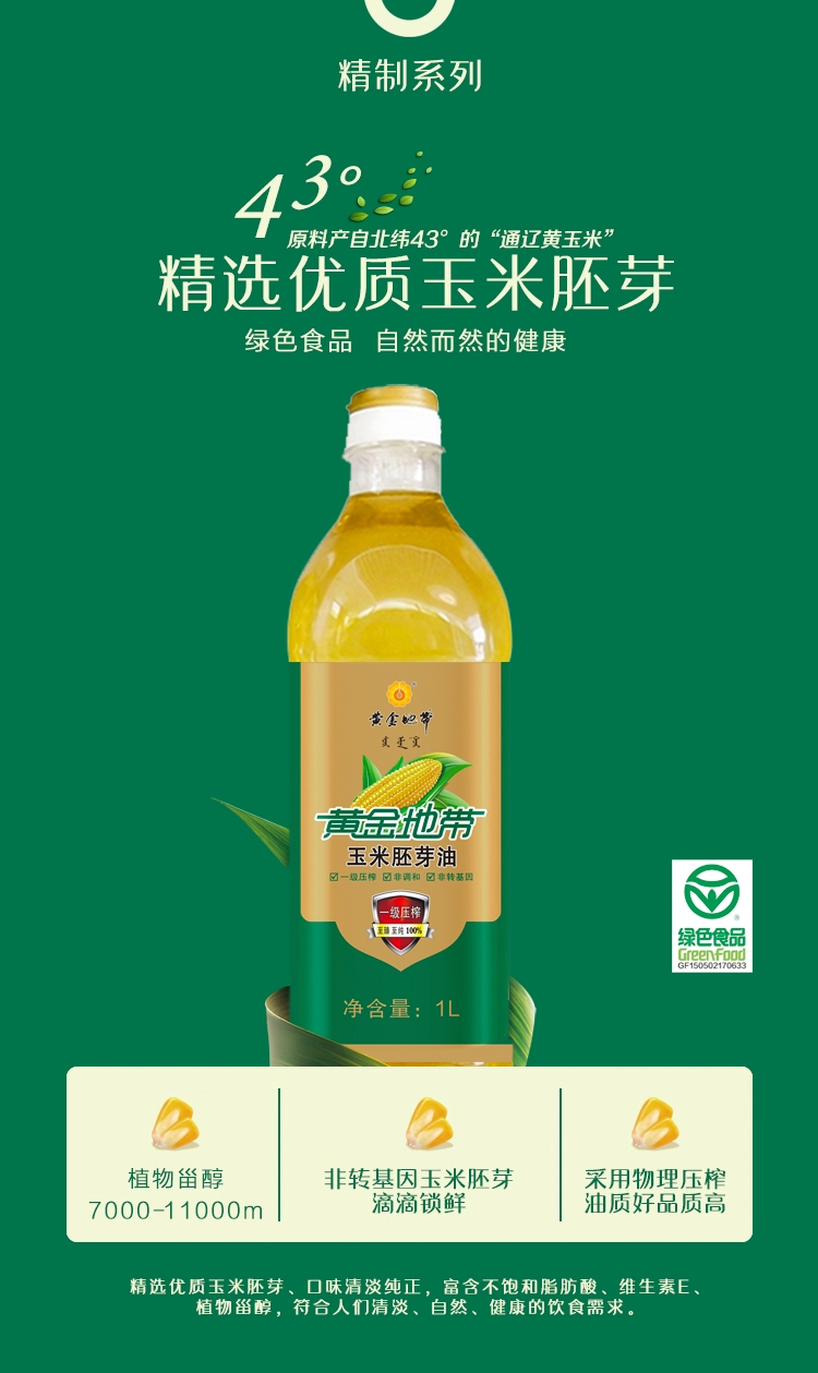 黃金地帶”玉米胚芽油選用世界三大黃金玉米帶之一—內(nèi)蒙古通遼市科爾沁區(qū)優(yōu)質(zhì)黃玉米胚芽為原料,經(jīng)現(xiàn)代工藝壓榨、精煉而成。通遼地區(qū)一年之中只種植一茬農(nóng)作物,具有日照時間長,晝夜溫差大,農(nóng)作物生長期長等特點,因此在原生態(tài)自然環(huán)境中生長的玉米品質(zhì)優(yōu)良。